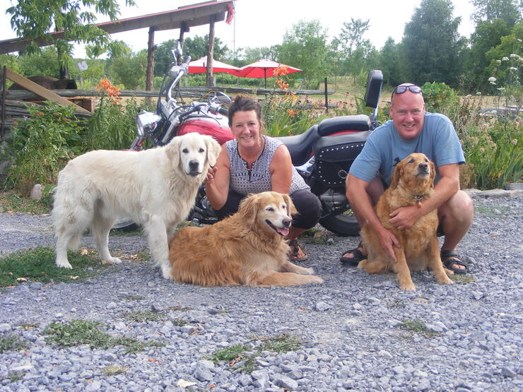 Three Dog Winery gets its name from John and Sacha’s three Golden Retrievers. The original three—Angus, Sienna and Chevy—are all buried at the vineyard as it was always their favourite place to be. The current three—Jersey, Rieki, and Bakkus—are there every chance they can get. All of the dogs are rescues from Golden Rescue Canada. Three Dog will always be dog-friendly (so if you travel with your pooch on board, you won’t have to leave him at home or ship him off to a kennel to go on a wine tour). Three Dog Winery invites you to bring them along, grab a bottle of wine, and take them for a walk down the many trails through the property.