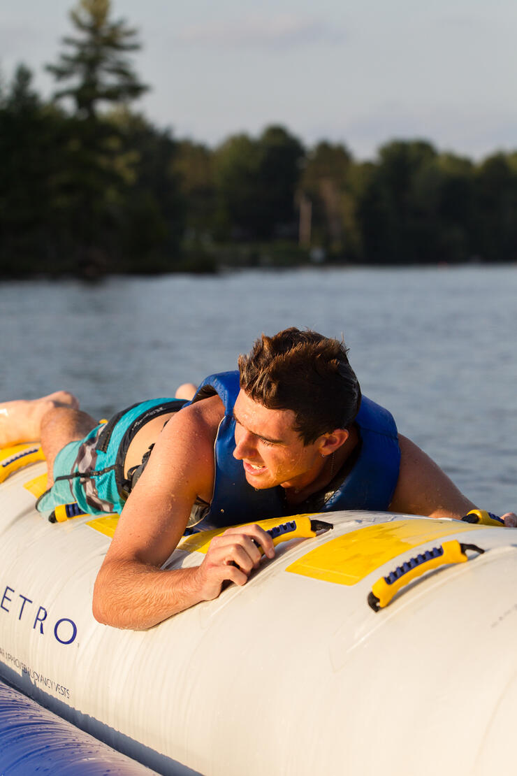 After a long day of riding, it’s safe to say that I was ready to peel myself out of my Speed & Strength gear and put on my swim shorts for a dip in the Lake. With our choice of watersports activities, we decided as a group to jump in a wakeboard boat and go for a ride on a banana raft because… why not? Apparently, we weren’t done riding for the day! Born and raised going to the lake, it wasn’t long before I was the only one left holding on for dear life on that banana raft. I had an absolute blast! With the sun setting, we dried off and sat out on the patio to enjoy some good grub and evening entertainment. The company was great, and the evening was spent chatting about our riding plans for the next day.