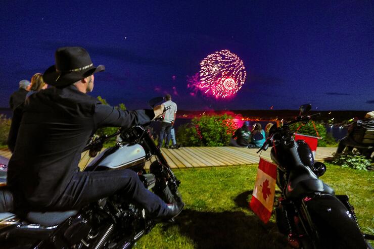 My band and I pulled into our campground spot late on the night of June 30, and you could already feel the energy in the air. So many people around just chatting, comparing travel times, admiring bikes, getting to know one another. In fact, one nice couple, Judie and Charlie Martin, took me, my wife Terri and my daughter Olivia on an evening cruise around Lake Temiskaming. Beautiful. That's the kind of good people you meet up there. Just willing to share what they've got.