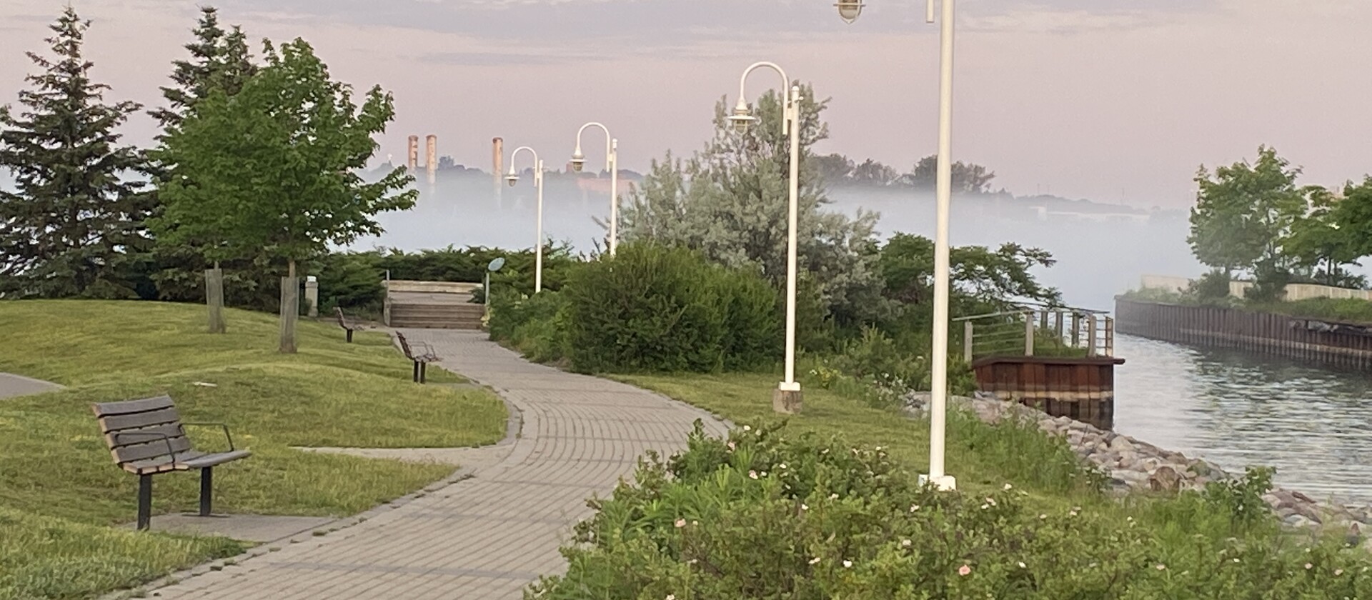 Sur le chemin du retour, en admirant la rive américaine depuis la Hub Trail, on remarque un élégant pavillon avancé sur l’eau. Non loin de là, une étonnante sculpture sonore vaut la peine qu’on s’y attarde. Il s’agit des bouches d’aération originales du dernier bateau au charbon qui traversait les wagons de train entre les deux villes jumelles.