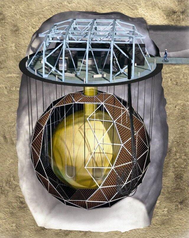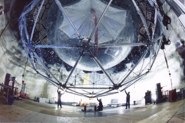 Engineers created a 12-metre diameter spherical acrylic vessel below ground. The vessel was bonded together underground from 125 pre-formed panels (since all detector components had to fit into the mine cage!) Atomic Energy of Canada lent 1,000 tonnes of heavy water that would be used to observe three separate neutrino reactions. This would allow scientists to understand if solar neutrinos changed flavour as they travelled to the Earth.
