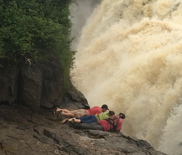 Après avoir fait le plein d’image et d’histoire, les aventuriers s’arrêtent pour dîner devant une chute de 90-100 pieds – et quel lunch! Non seulement la chute a-t-elle un aspect magique, en tant cachée au fond du canyon, le lunch ajoute à l’expérience. L’aventure se poursuit ensuite avec l’escalade de la chute où le passionné parle de flore boréale : fruits, plantes et thés – bref, tout ce dont se servaient nos ancêtres pour se nourrir et se soigner.